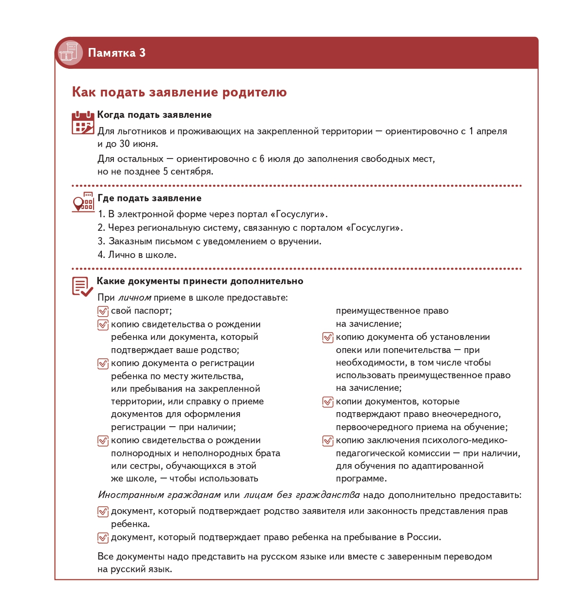 Также уточняется, какие документы представляют родители (законные представители) детей — иностранных граждан.